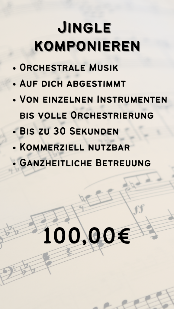 Für Podcasts, Intros, Social Media und Kanäle kann ein orchestrales Jingle passen. Von Streichern, Schlagwerk, Holz- und Blechbläser kann alles dabei sein. Egal, was Du brauchst: Es wird deinem Wunsch entsprechen.
