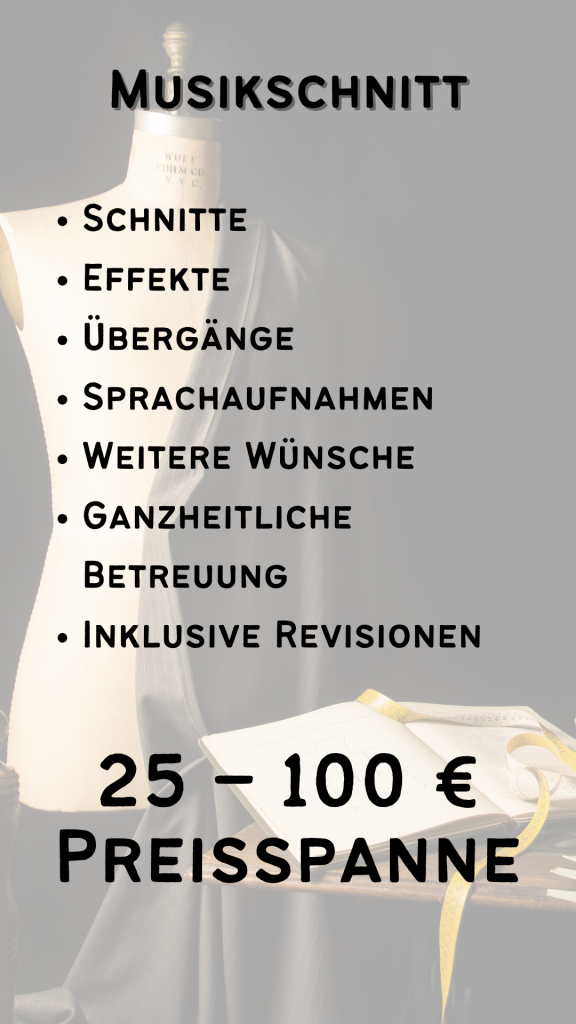Ich biete Dir an, für Dich deine Musik zu schneiden. Wenn Du einen Schnitt mit mehreren Liedern, Effekten und Übergängen brauchst und dabei eine hohe Qualität mit guter Betreuung haben möchtest, bist Du bei mir genau richtig!